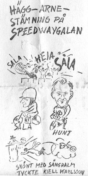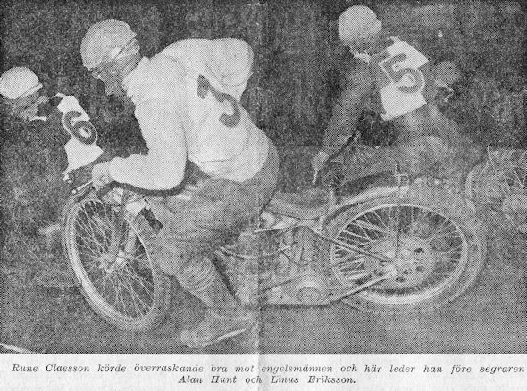 Speakern Curt Alberts hoppades i sitt häls-ningsanförande att engelsmännen skulle lära svenskarna åka speedway och "Brummies", som Birminghams speedwaylag kallas, tog honom på orden. I klubbmatchen blev det rena utklass-ningen. Engelsmännen behärskade den hårda banan och elljuset bättre än svenskarna och kunde gå mycket hårdare än Kaparna i de långa kurvorna, där svenskarna gärna fick stoppsladdar om de försökte dra på. ". Det verka de stundtals som om engelsmännen kunde gå förbi en framförvarande svensk precis när de behagade, men nar de väl tagit ledningen körde de inte fortare än vad som behövdes för att segern skulle bärgas. Särskilt imponerade Alan Hunt. Han satt som klistrad vid sin maskin och det bekom honom inget hur maskinen än kastade och krängde. Hunt vann också .samtliga heat och var inte mycket att göra åt i scratch racens final. TORSTEN KOM MOT SLUTET Om engelsmännens överlägsenhet vittnar slutresultatet 58 - 24 och inte mindre än sju femettor. Enda svenska segern noterades i sista heatet, där Torsten Karlsson vann efter en fantastisk åkning mot Lionell Watling Båda förarna växeldrog genom alla fyra varven och gick förbi varandra med både inner- och ytterkants-slickare. |