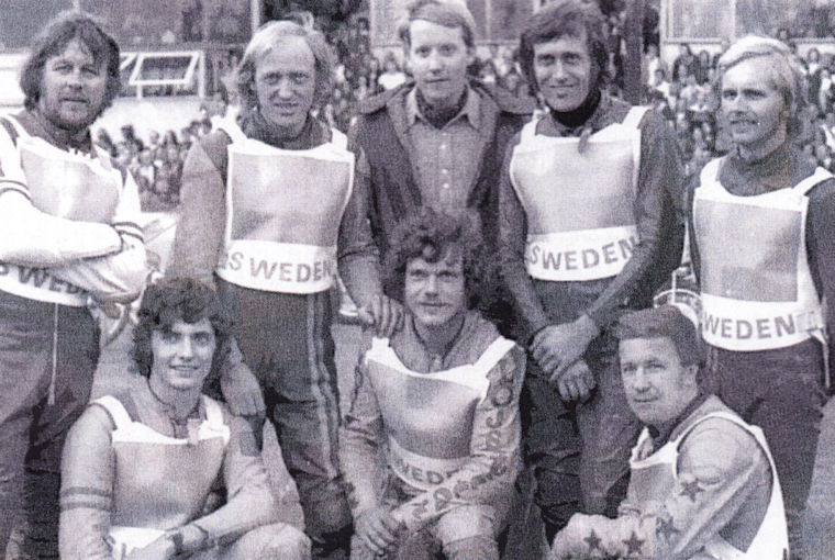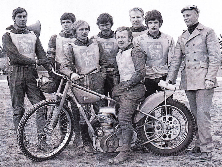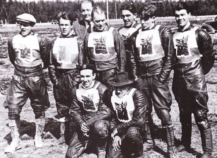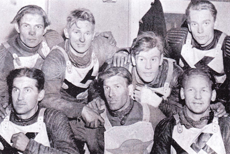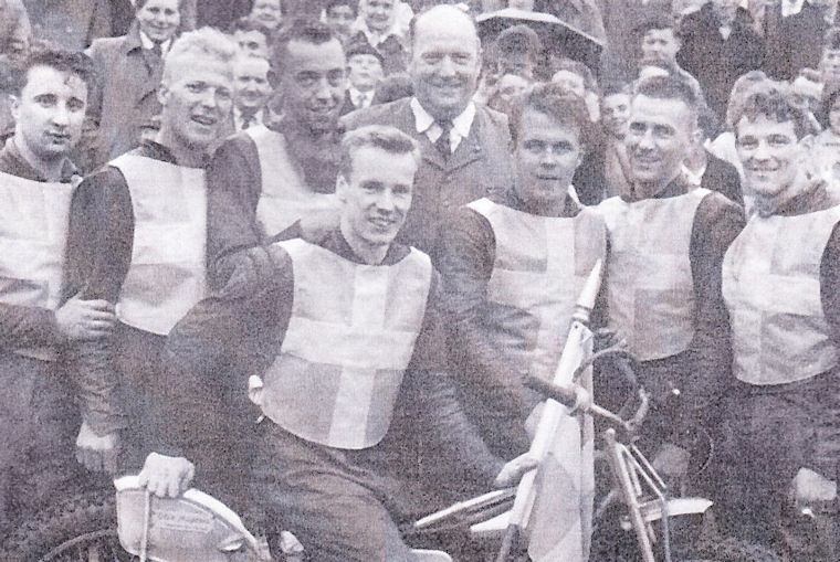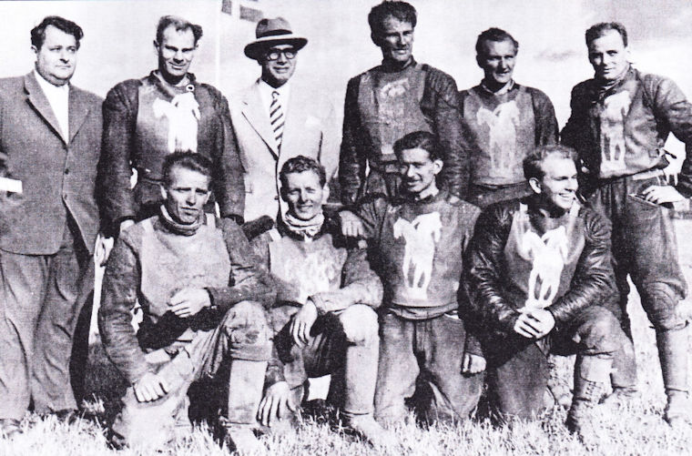 Svenska ladslaget mot England 1958; Från vänster: Dan Forsberg, P-O Söderman, Birger Forsberg, Ove Fundin (på cykeln), Olle Nygren, Joel Jansson och Rune Sörmander.